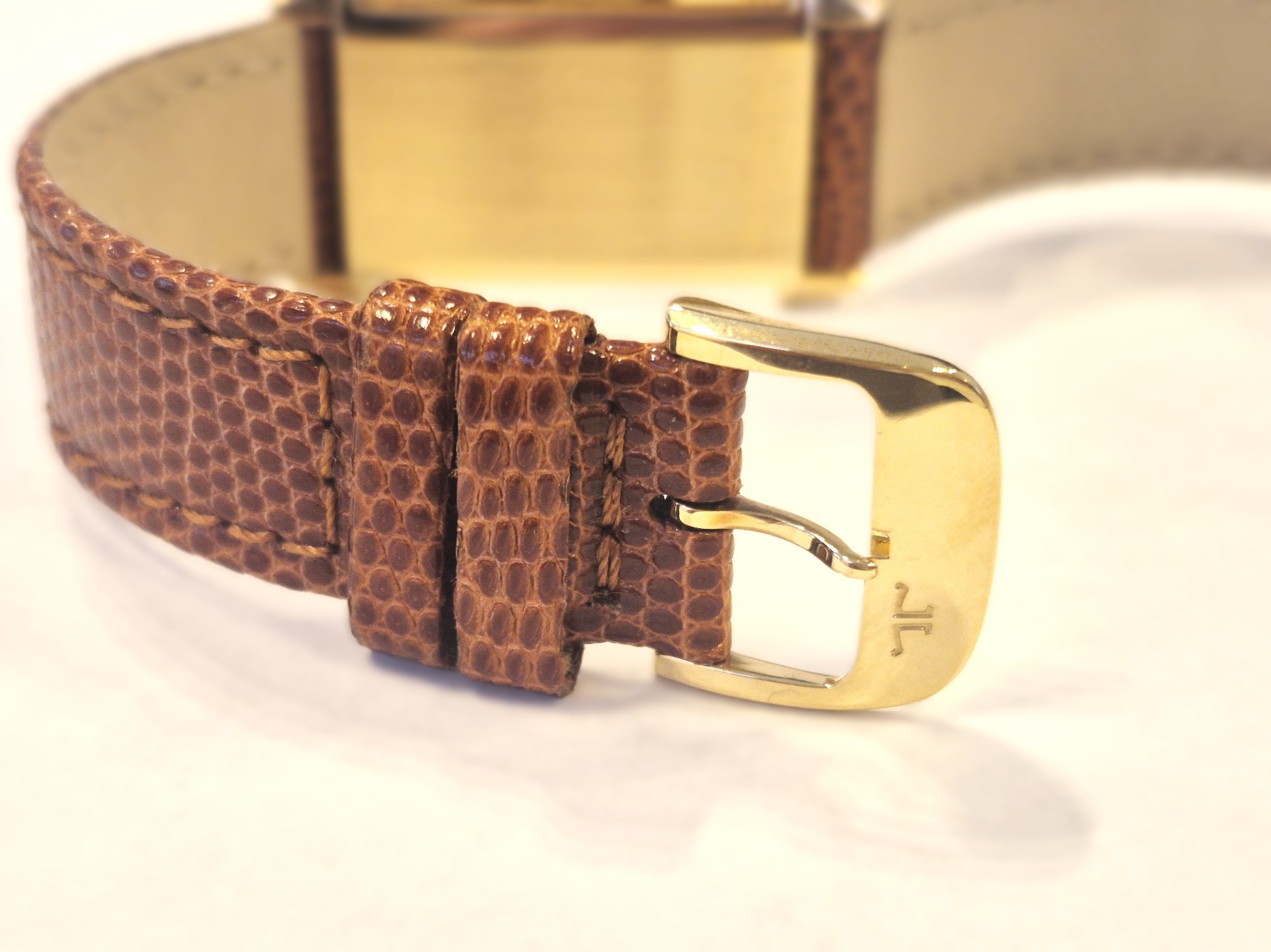 Sehr gut erhaltene Armbanduhr mit Handaufzug. Gehäuse und Dornschließe (Original) sind aus 750/- Gold. Die Uhr hat ein Saphirglas und gebläute Zeiger.